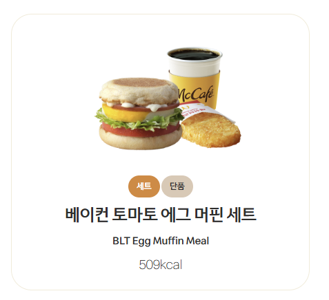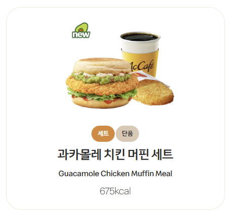 | 치킨 치즈 맥머핀 | 3,900원 | 5,700원 | 맥모닝 인기 1위 |