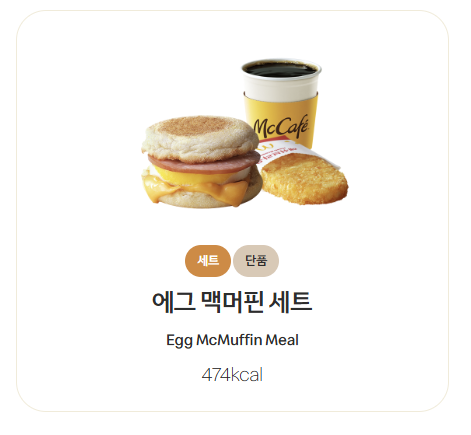 | 소시지 에그 맥머핀 | 4,000원 | 4,900원 | 든든한 단백질 |